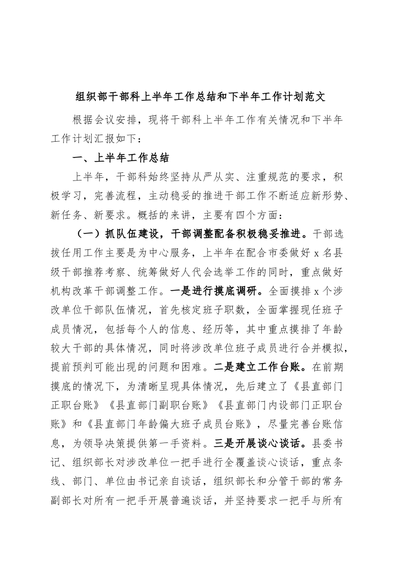 / 组织部干部科上半年工作总结和下半年计划汇报报告