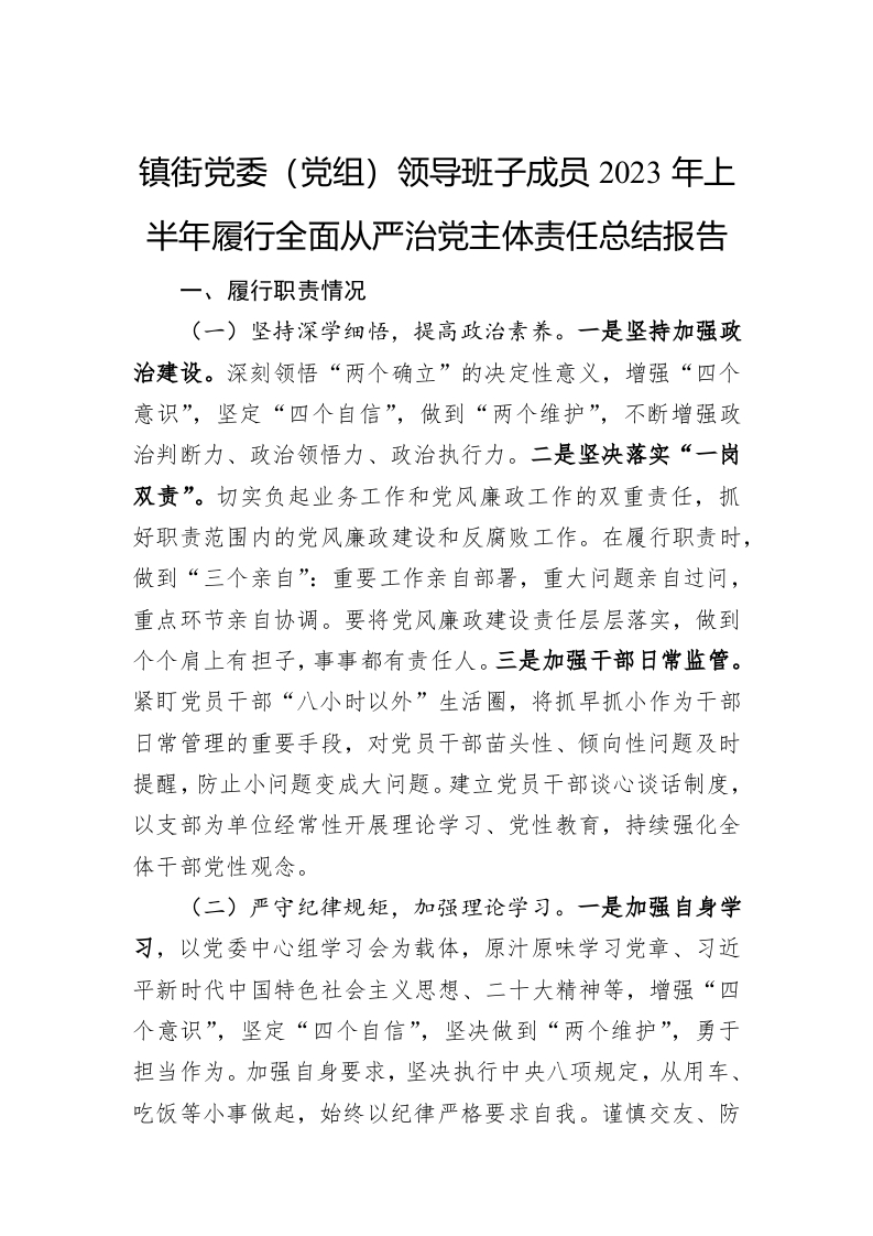 / 镇街党委(党组)领导班子成员2023年上半年履行全面从严治党主体责任总结报告