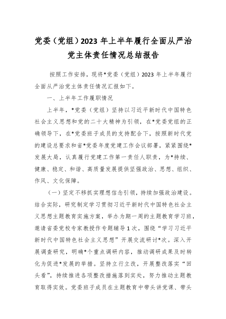 / 党委(党组)2023年上半年履行全面从严治党主体责任情况总结报告