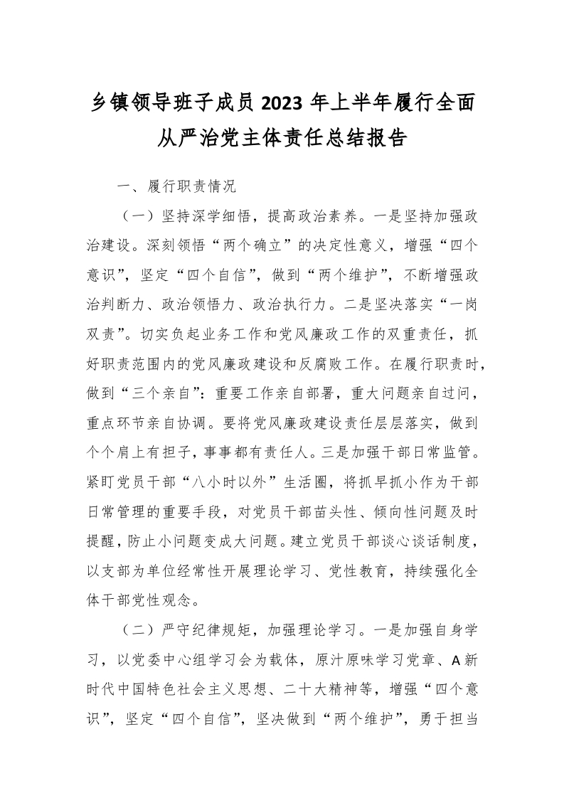 / 乡镇领导班子成员2023年上半年履行全面从严治党主体责任总结报告