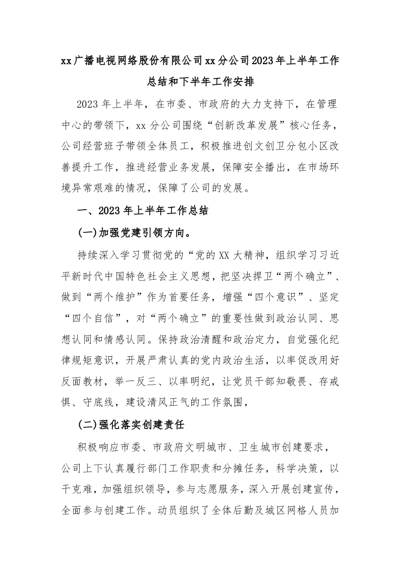 / xx广播电视网络股份有限公司xx分公司2023年上半年工作总结和下半年工作安排
