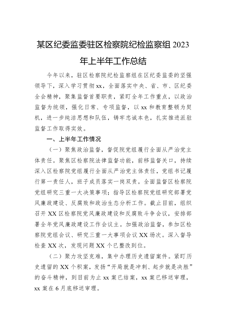 / 某区纪委监委驻区检察院纪检监察组2023年上半年工作总结
