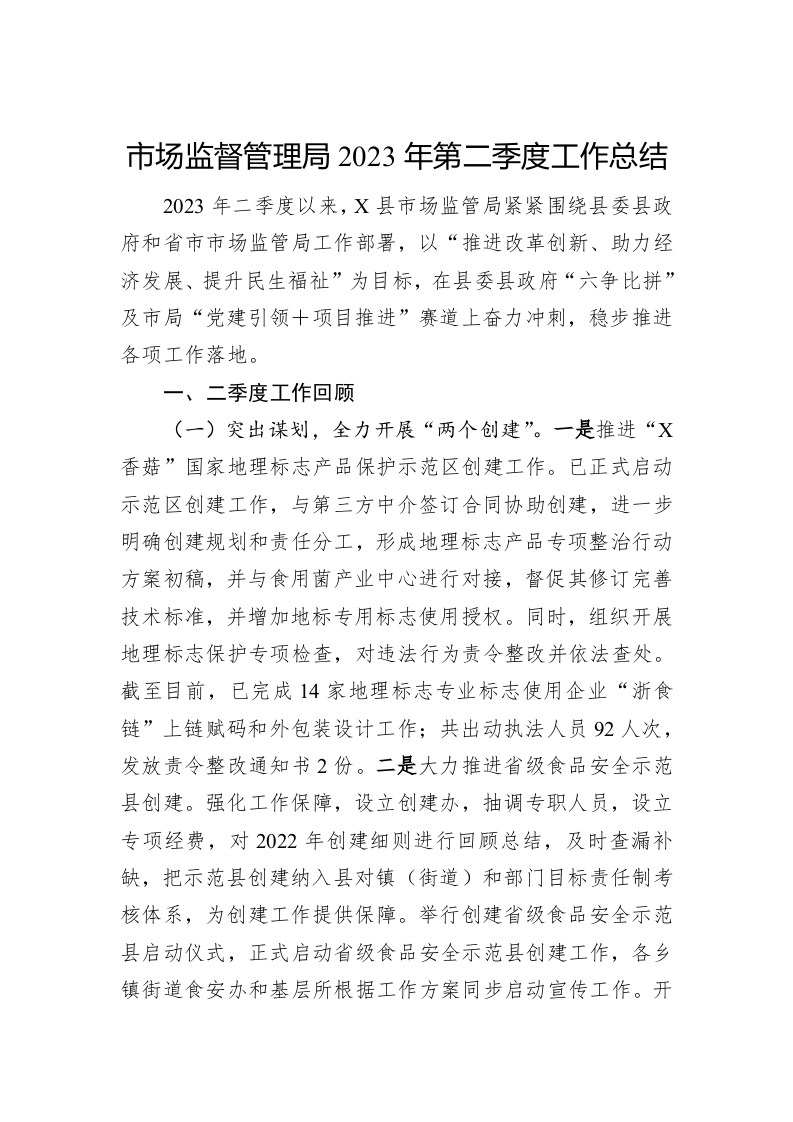 市场监督管理局2023年第二季度工作总结