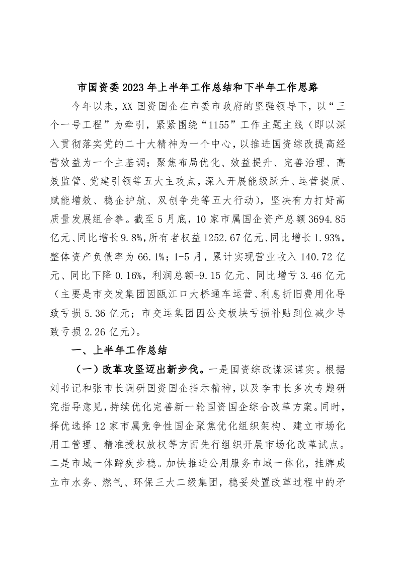 / 市国资委2023年上半年工作总结和下半年工作思路