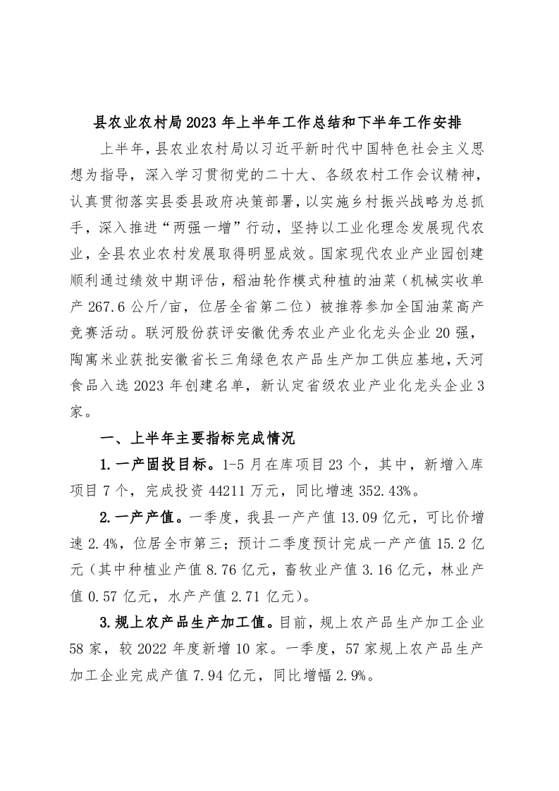 / 县农业农村局2023年上半年工作总结和下半年工作安排