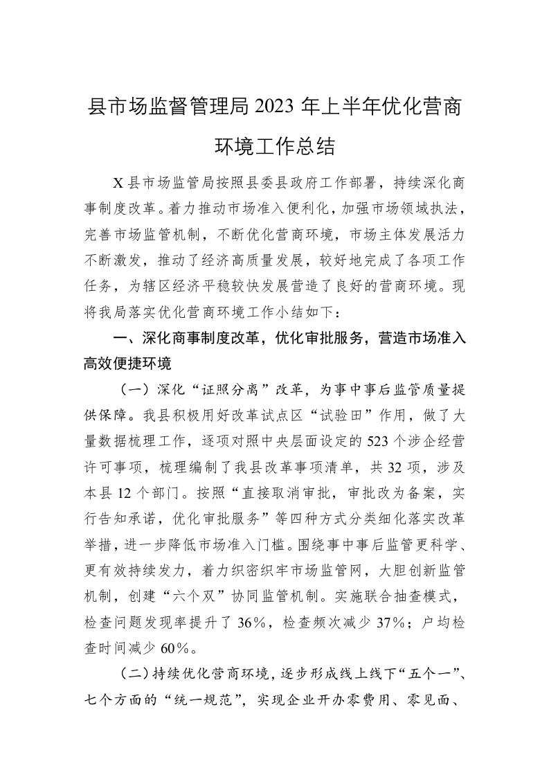 / 县市场监督管理局2023年上半年优化营商环境工作总结