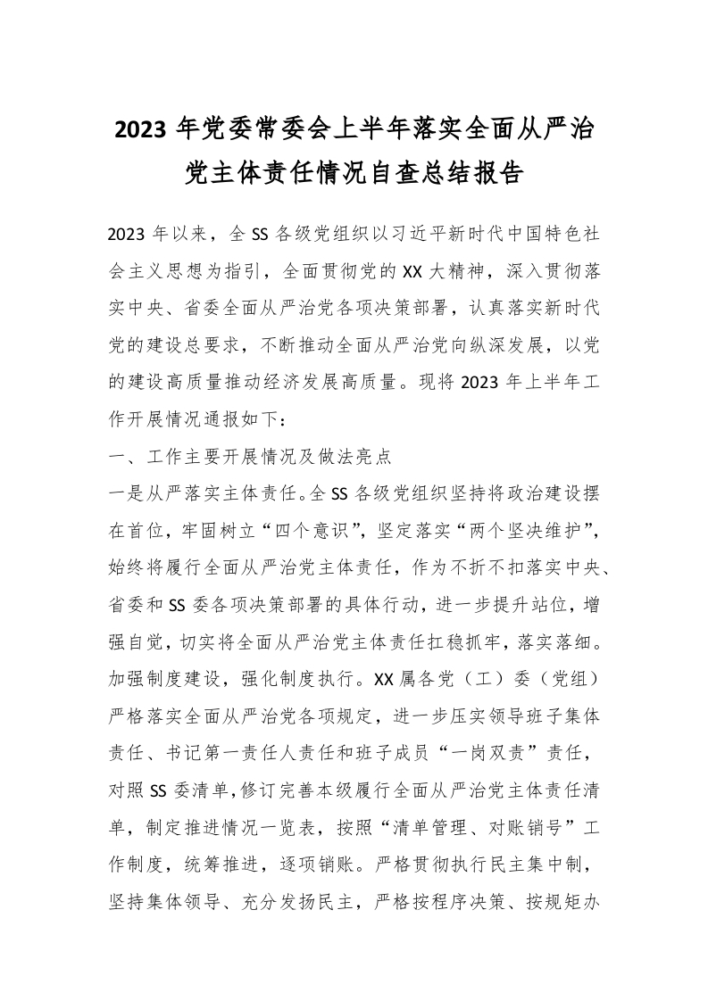 2023年党委常委会上半年落实全面从严治党主体责任情况自查总结报告