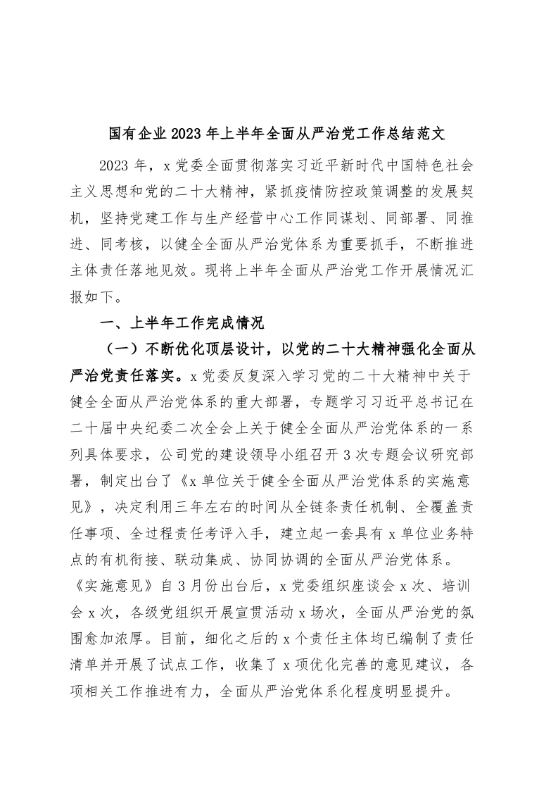 / 国有企业2023年上半年全面从严治党工作总结(集团公司,汇报报告)