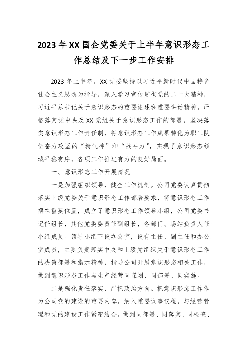 / 2023年XX国企党委关于上半年意识形态工作总结及下一步工作安排