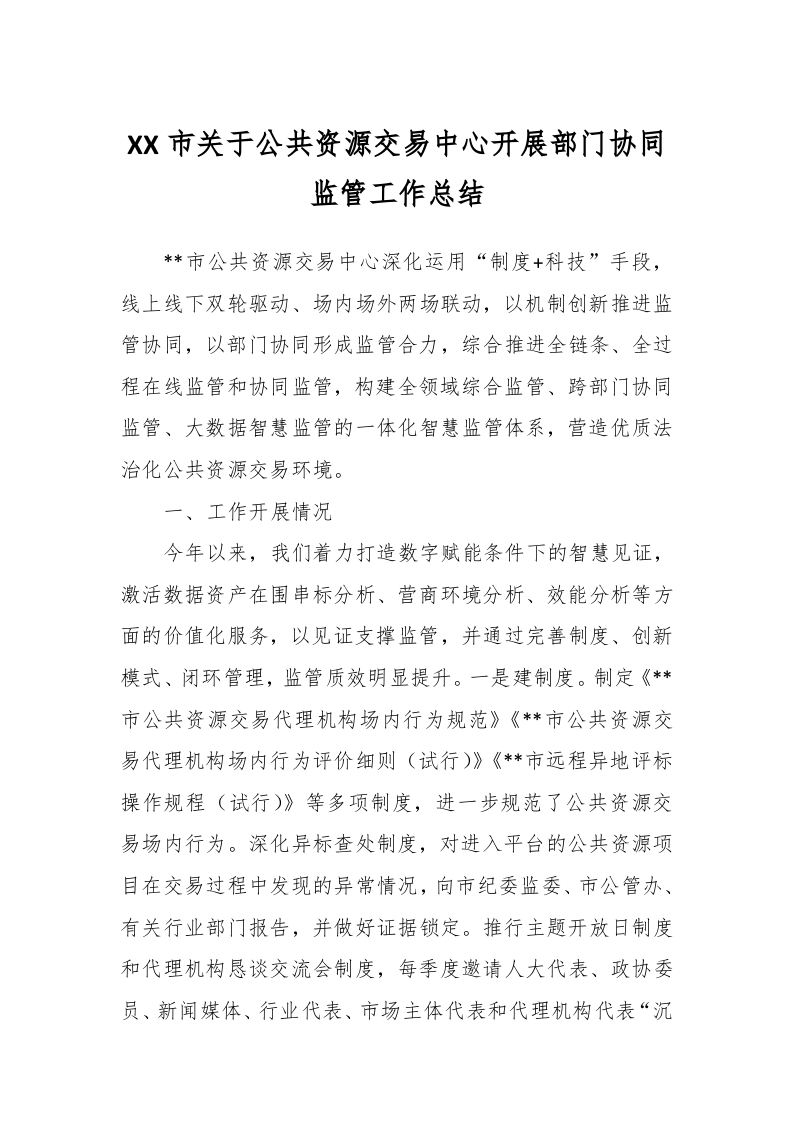/ XX市关于公共资源交易中心开展部门协同监管工作总结