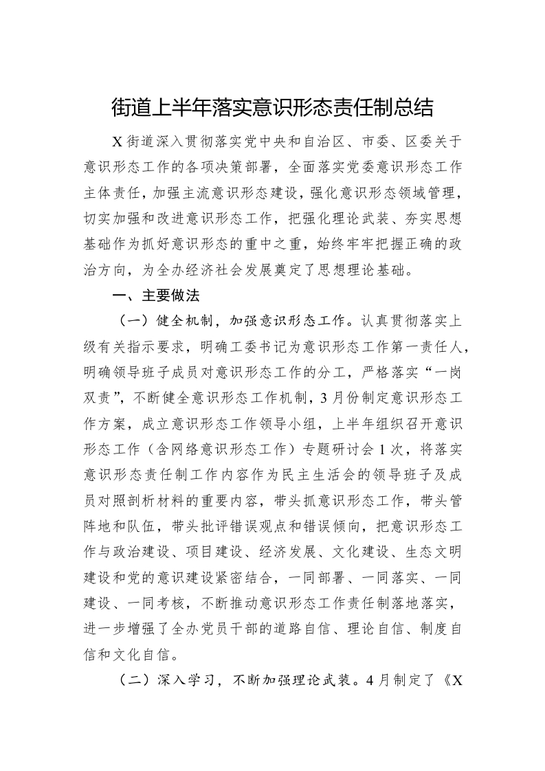 / 街道上半年落实意识形态责任制总结