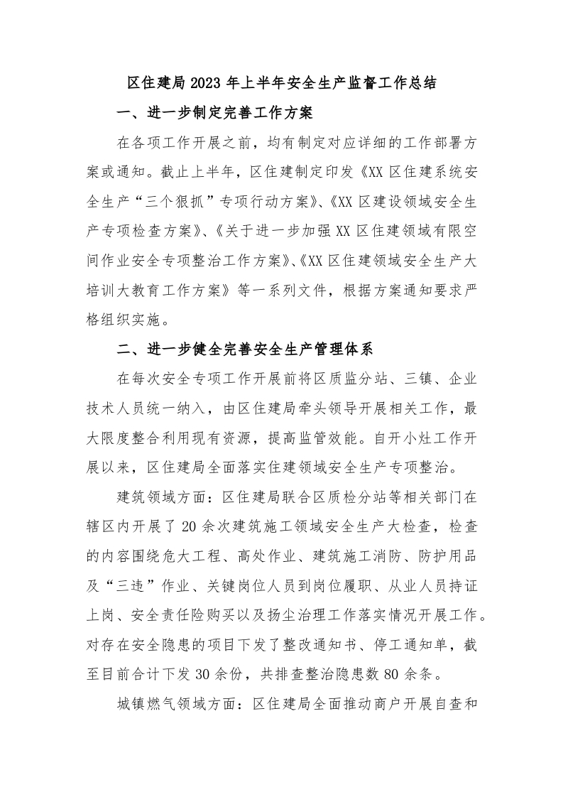 区住建局2023年上半年安全生产监督工作总结
