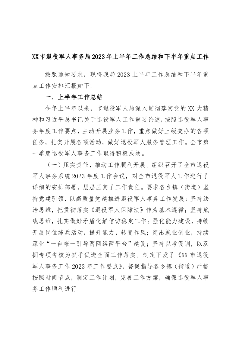 / XX市退役军人事务局2023年上半年工作总结和下半年重点工作
