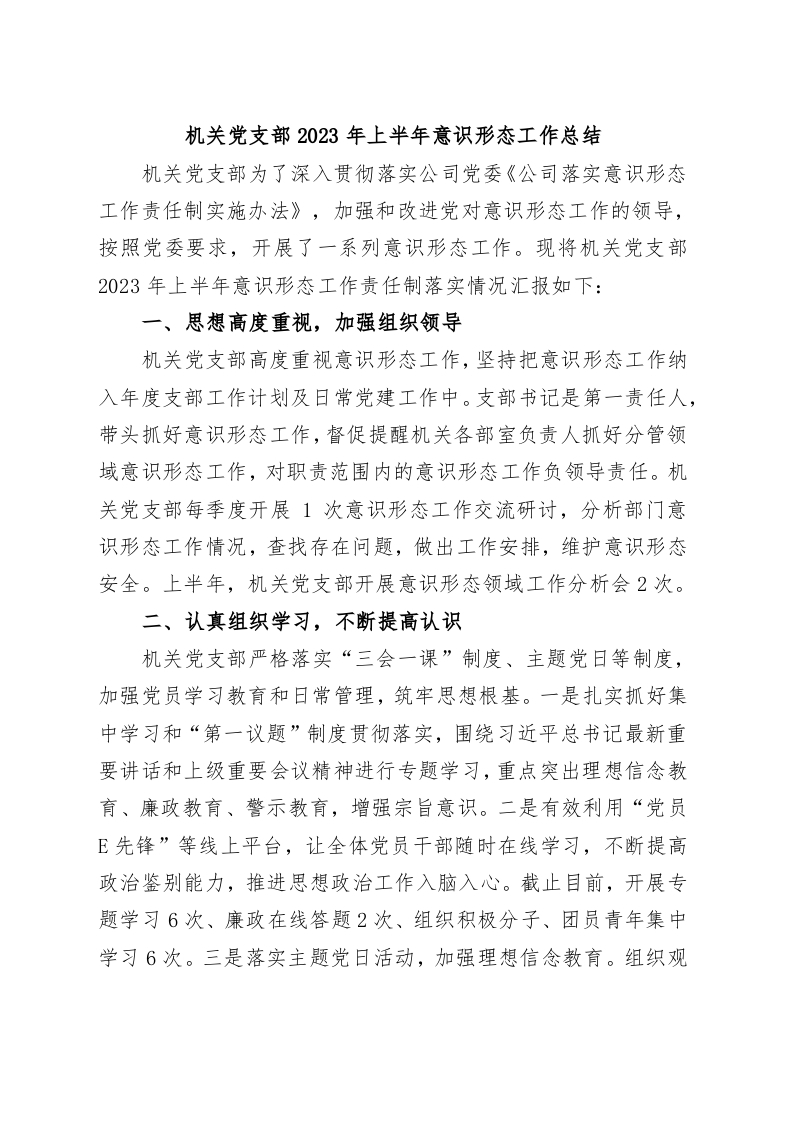 / 机关党支部2023年上半年意识形态工作总结