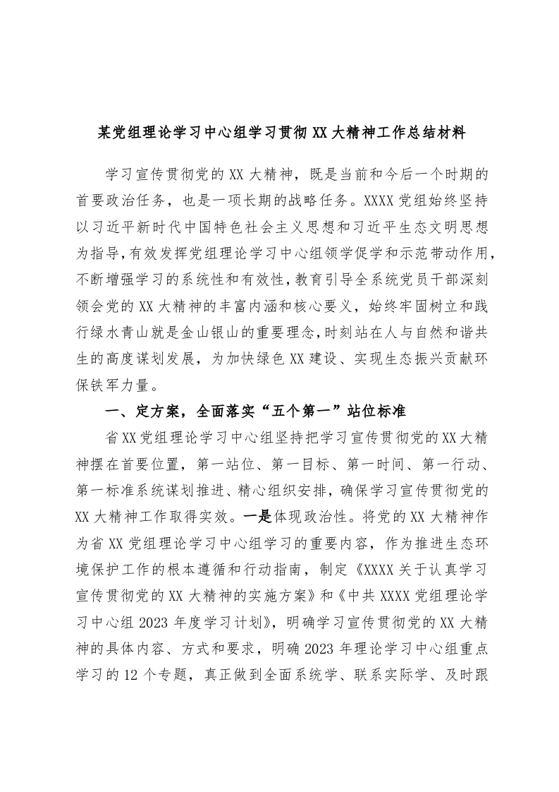 某党组理论学习中心组学习贯彻XX大精神工作总结材料