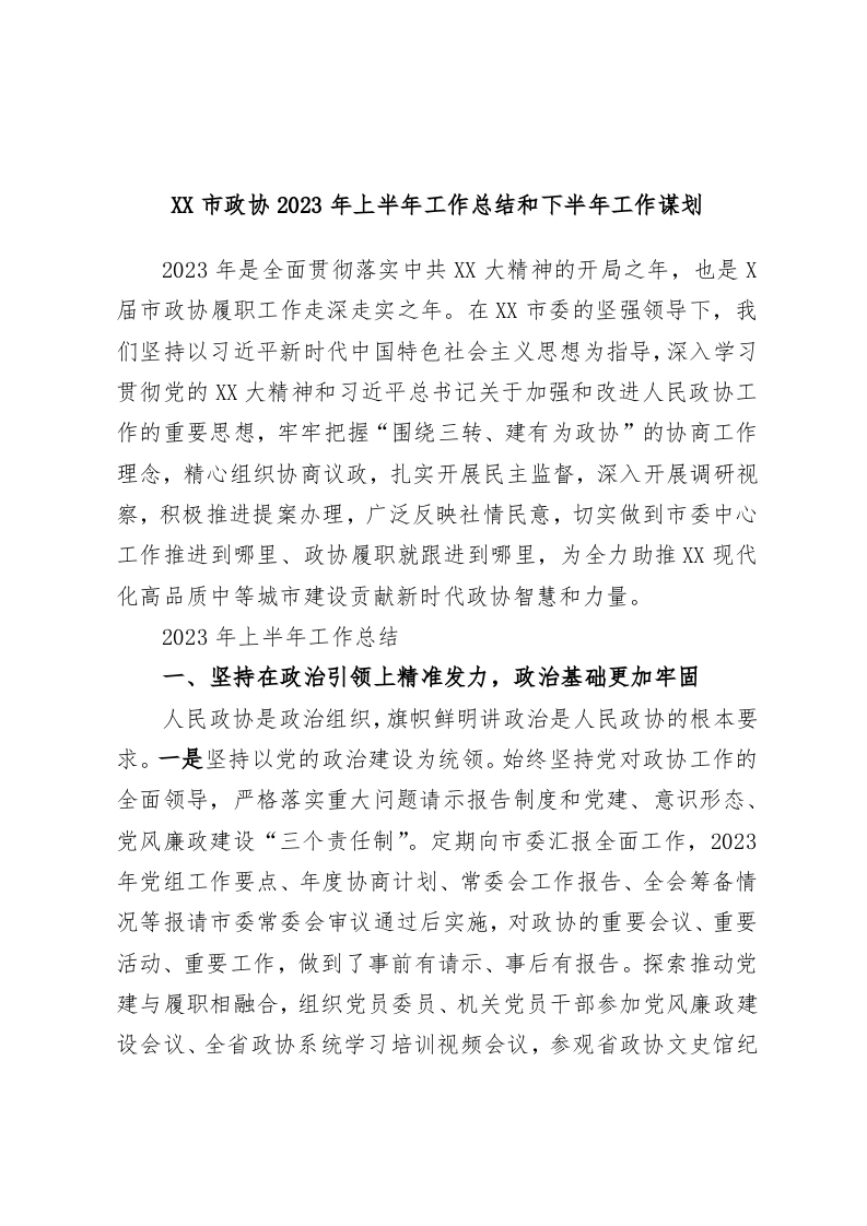 / XX市政协2023年上半年工作总结和下半年工作谋划