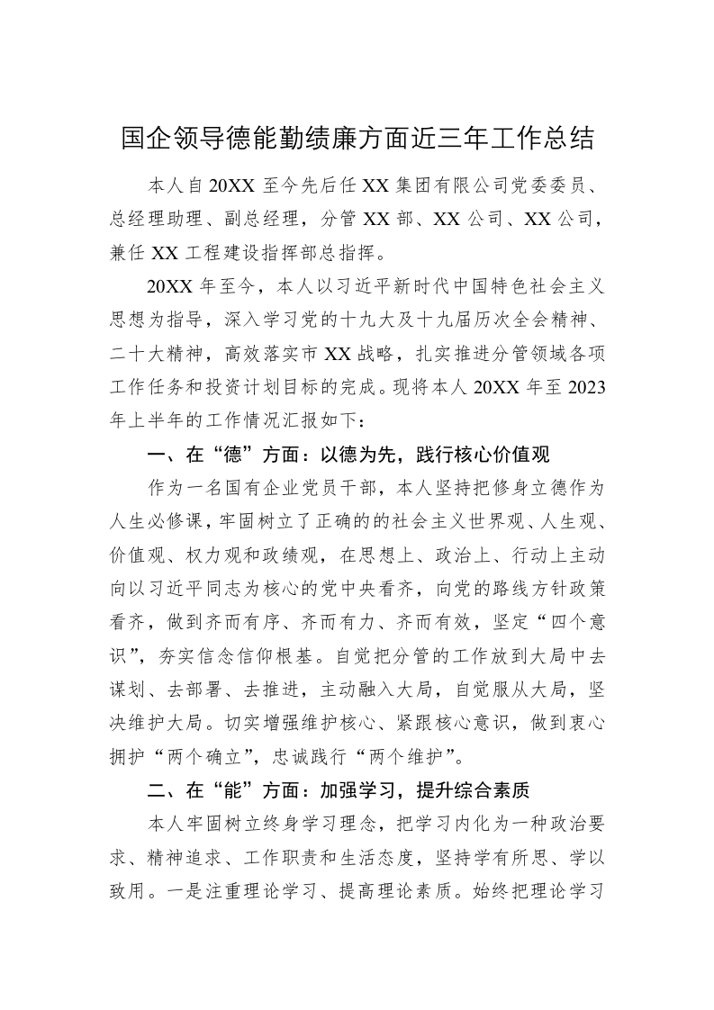 国企领导德能勤绩廉方面近三年工作总结