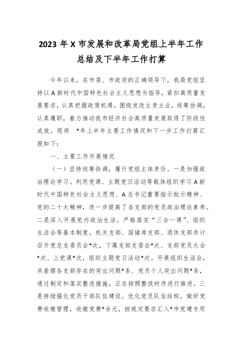 / 2023年X市发展和改革局党组上半年工作总结及下半年工作打算