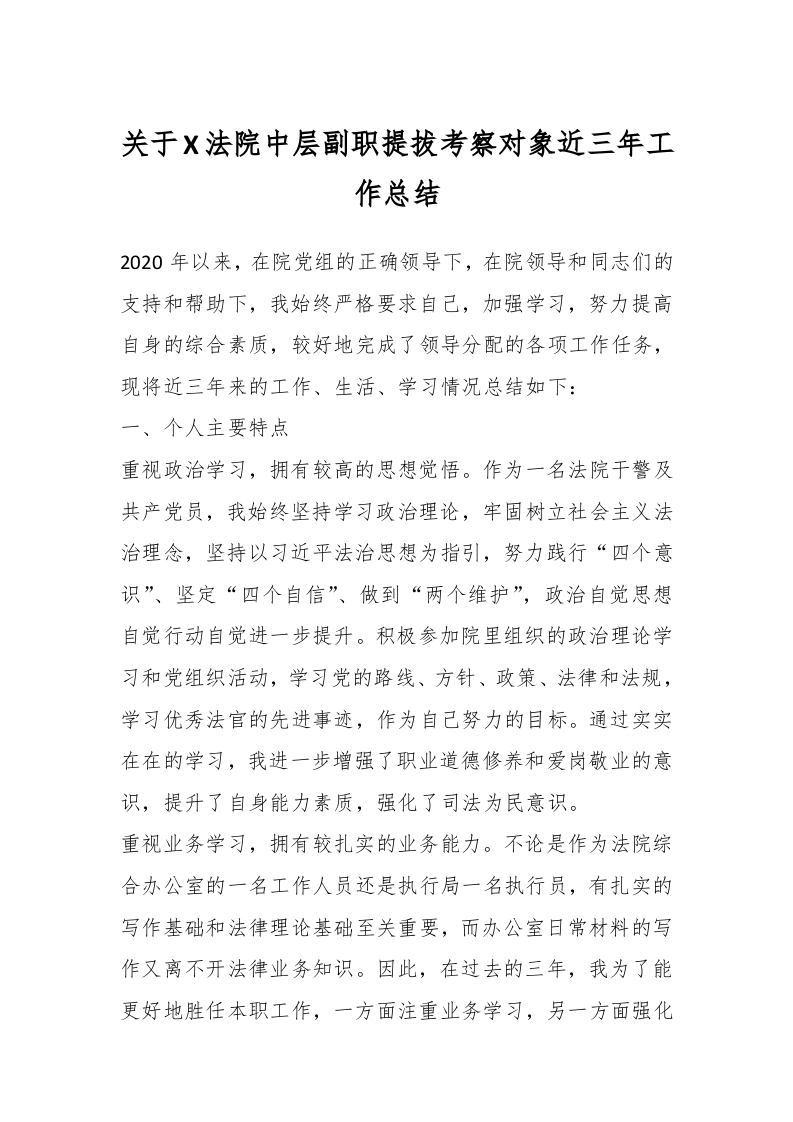 / 关于X法院中层副职提拔考察对象近三年工作总结