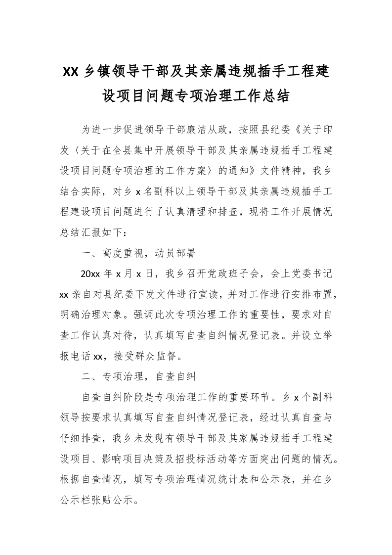/ XX乡镇领导干部及其亲属违规插手工程建设项目问题专项治理工作总结