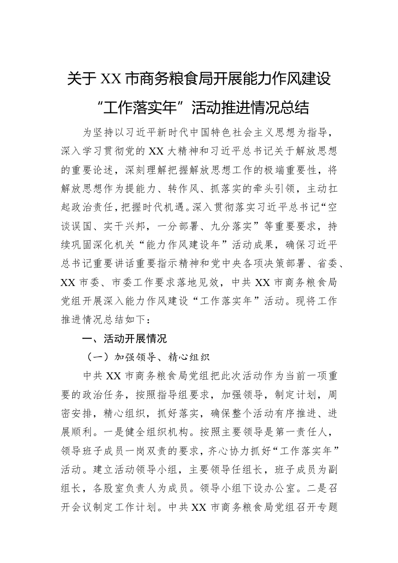 / 关于XX市商务粮食局开展能力作风建设“工作落实年”活动推进情况总结