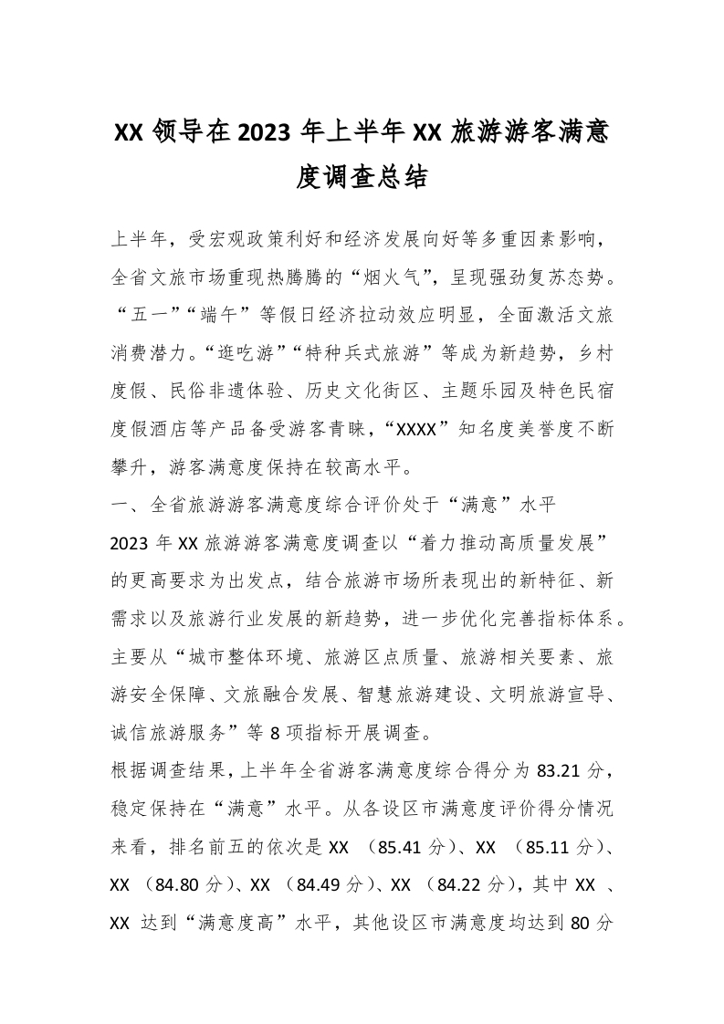 / XX领导在2023年上半年XX旅游游客满意度调查总结