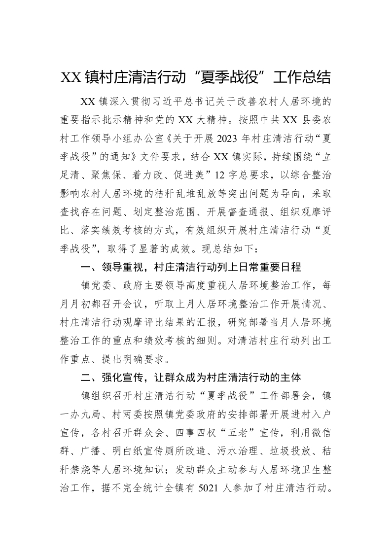 / XX镇村庄清洁行动“夏季战役”工作总结