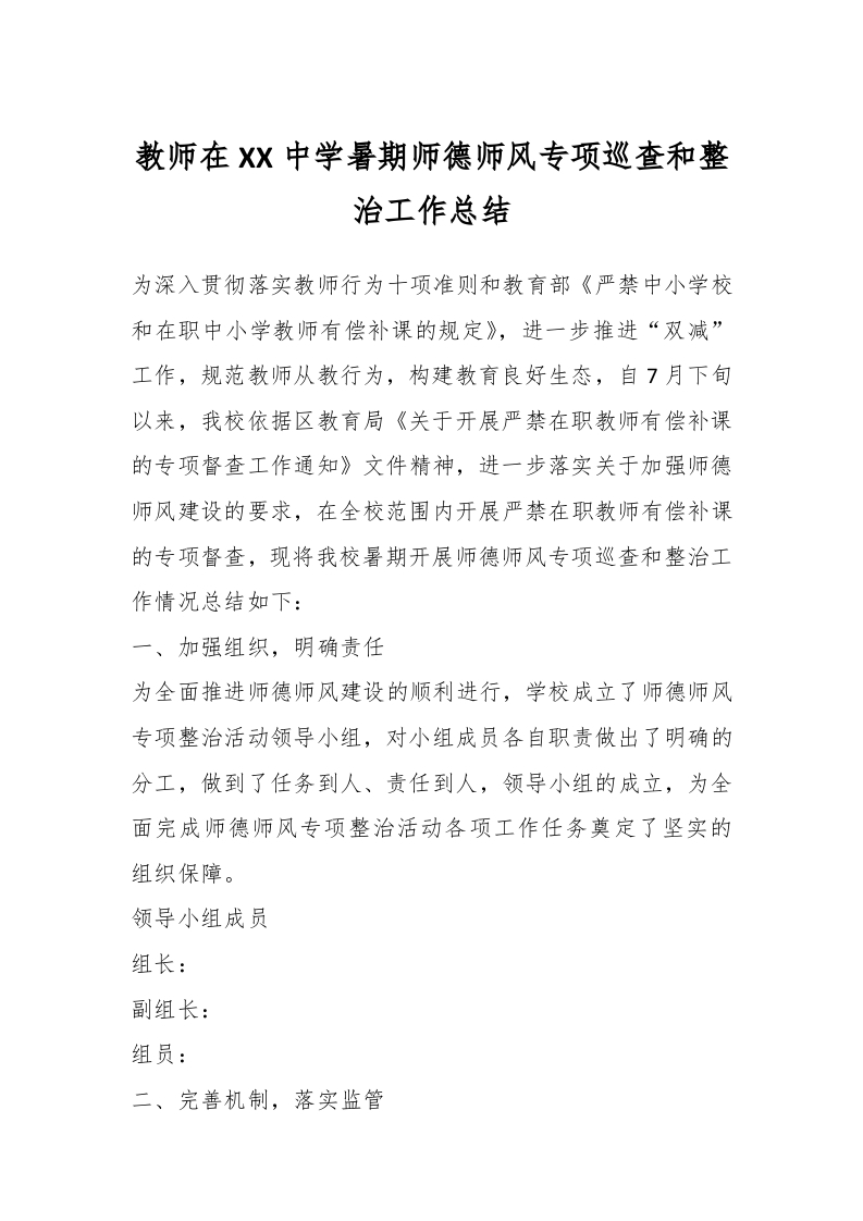 教师在XX中学暑期师德师风专项巡查和整治工作总结