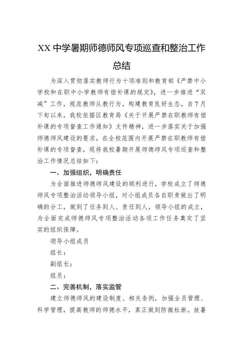 / XX中学暑期师德师风专项巡查和整治工作总结