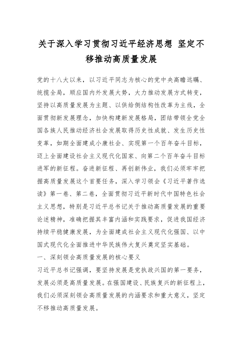 关于深入学习贯彻习近平经济思想 坚定不移推动高质量发展