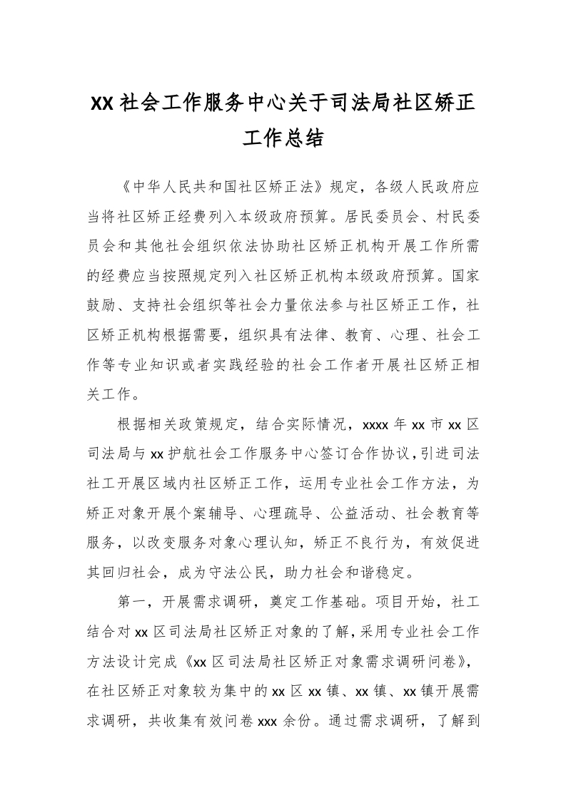 / XX社会工作服务中心关于司法局社区矫正工作总结