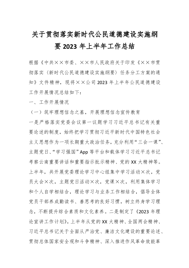 / 关于贯彻落实新时代公民道德建设实施纲要2023年上半年工作总结