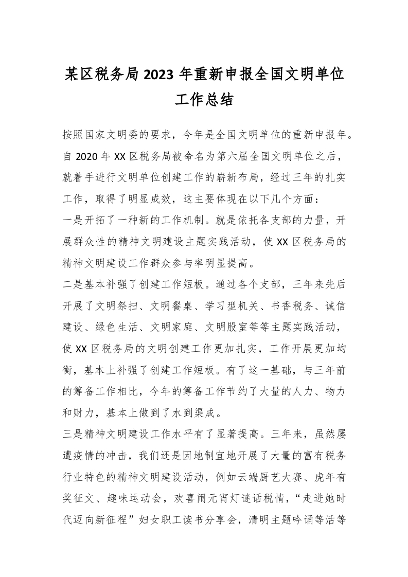 / 某区税务局2023年重新申报全国文明单位工作总结