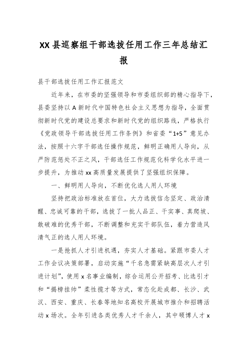 / XX县巡察组干部选拔任用工作三年总结汇报