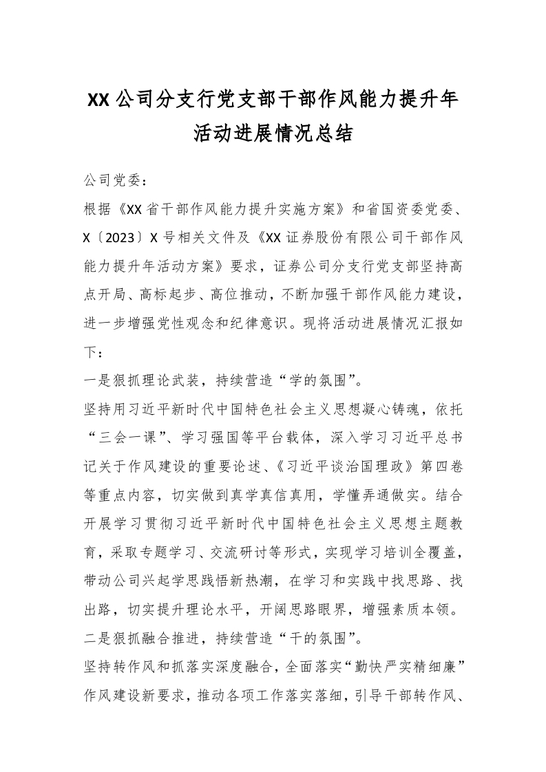 / XX公司分支行党支部干部作风能力提升年活动进展情况总结