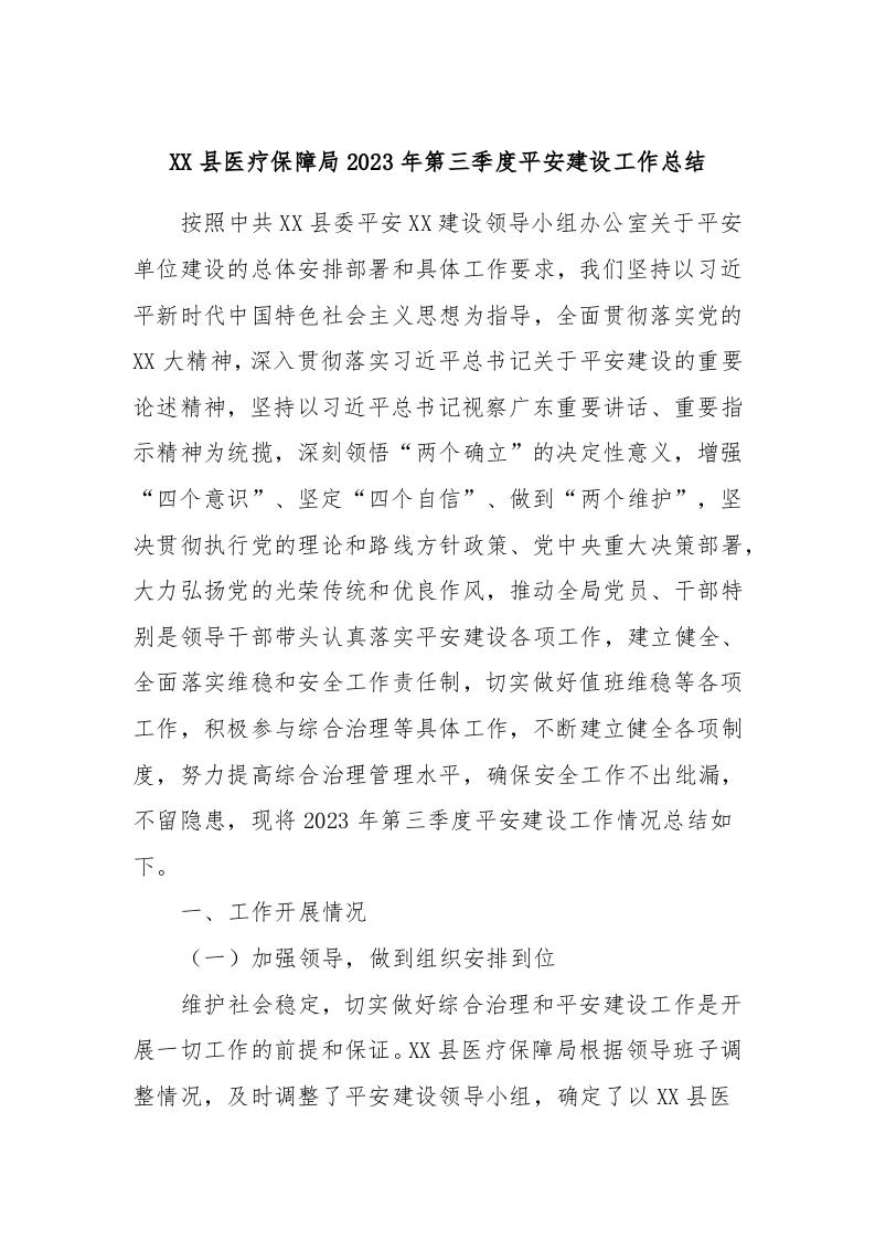 / XX县医疗保障局2023年第三季度平安建设工作总结