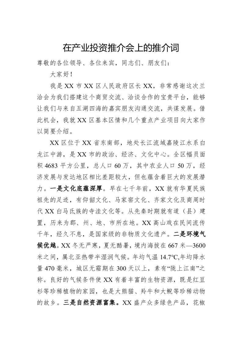 / 在产业投资推介会上的推介词
