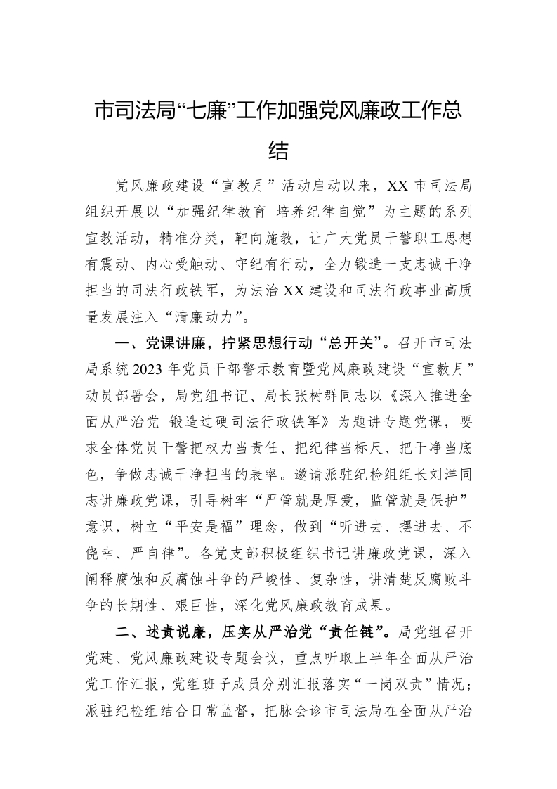 / 市司法局“七廉”工作加强党风廉政工作总结