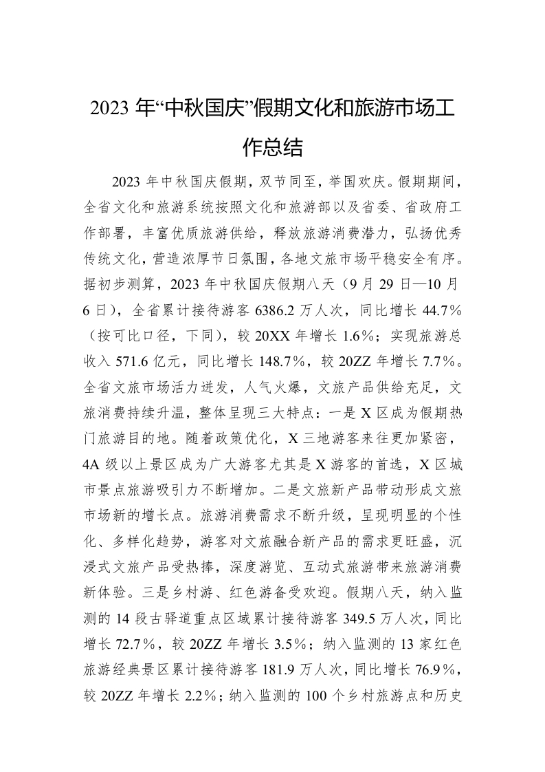 2023年“中秋国庆”假期XX省文化和旅游市场工作总结