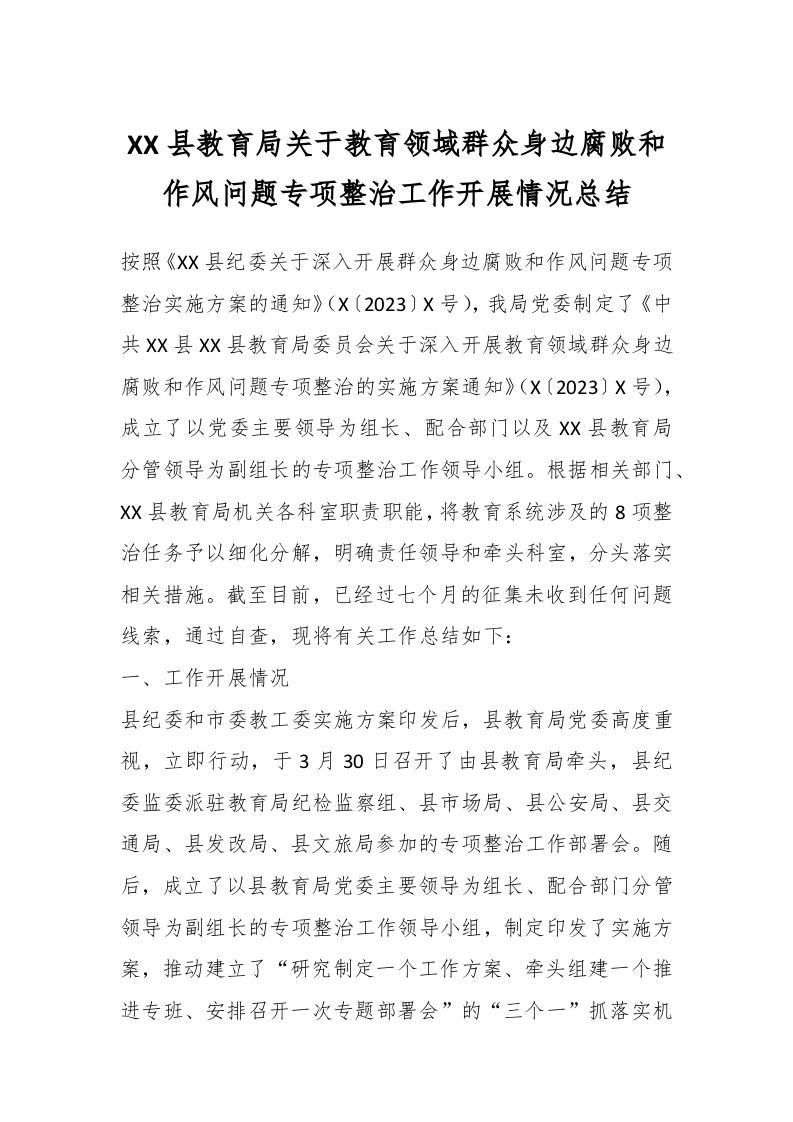 / XX县教育局关于教育领域群众身边腐败和作风问题专项整治工作开展情况总结