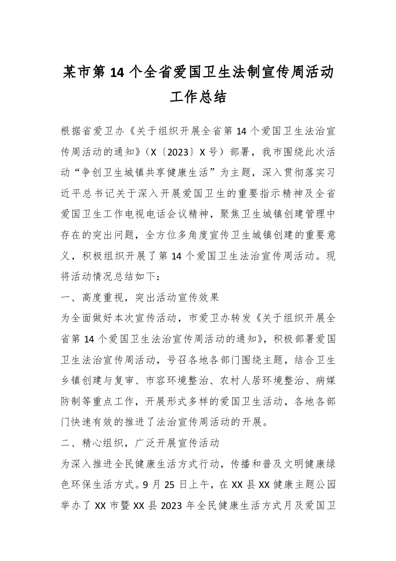/ 某市第14个全省爱国卫生法制宣传周活动工作总结