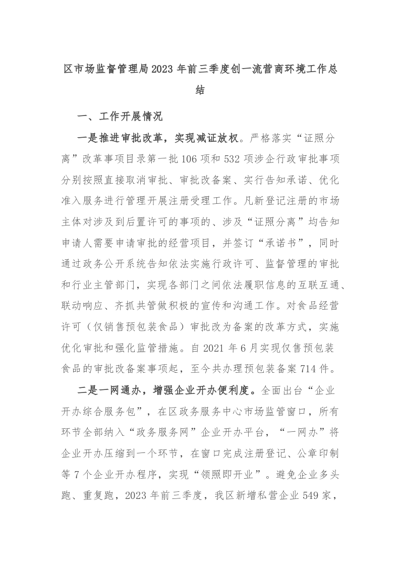 / 区市场监督管理局2023年前三季度创一流营商环境工作总结