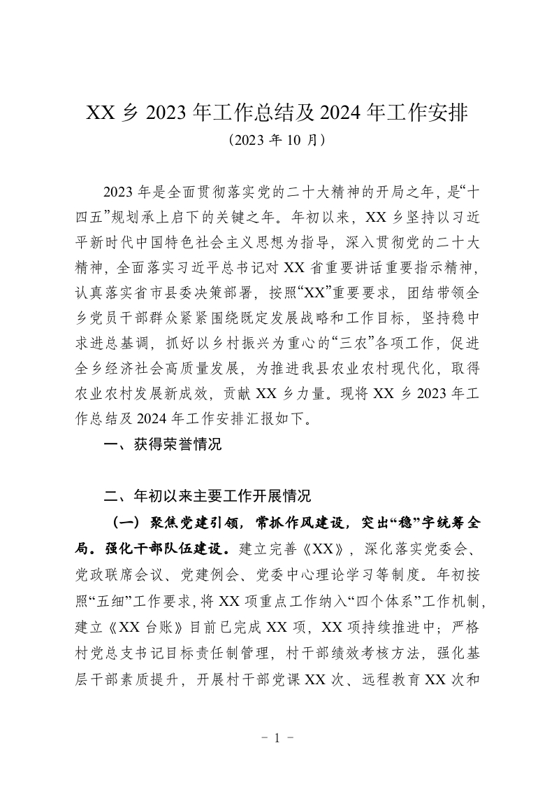 / XX乡(镇)2023年工作总结及2024年工作安排