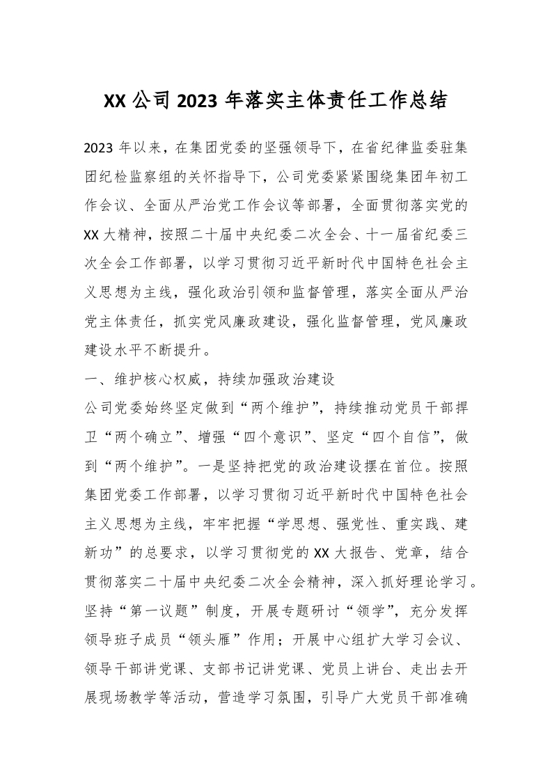 / XX公司2023年落实主体责任工作总结