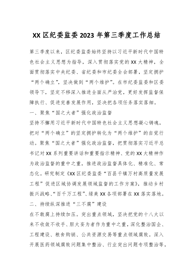 / XX区纪委监委2023年第三季度工作总结