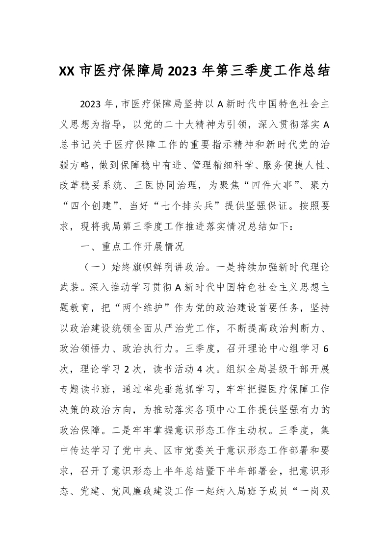 / XX市医疗保障局2023年第三季度工作总结