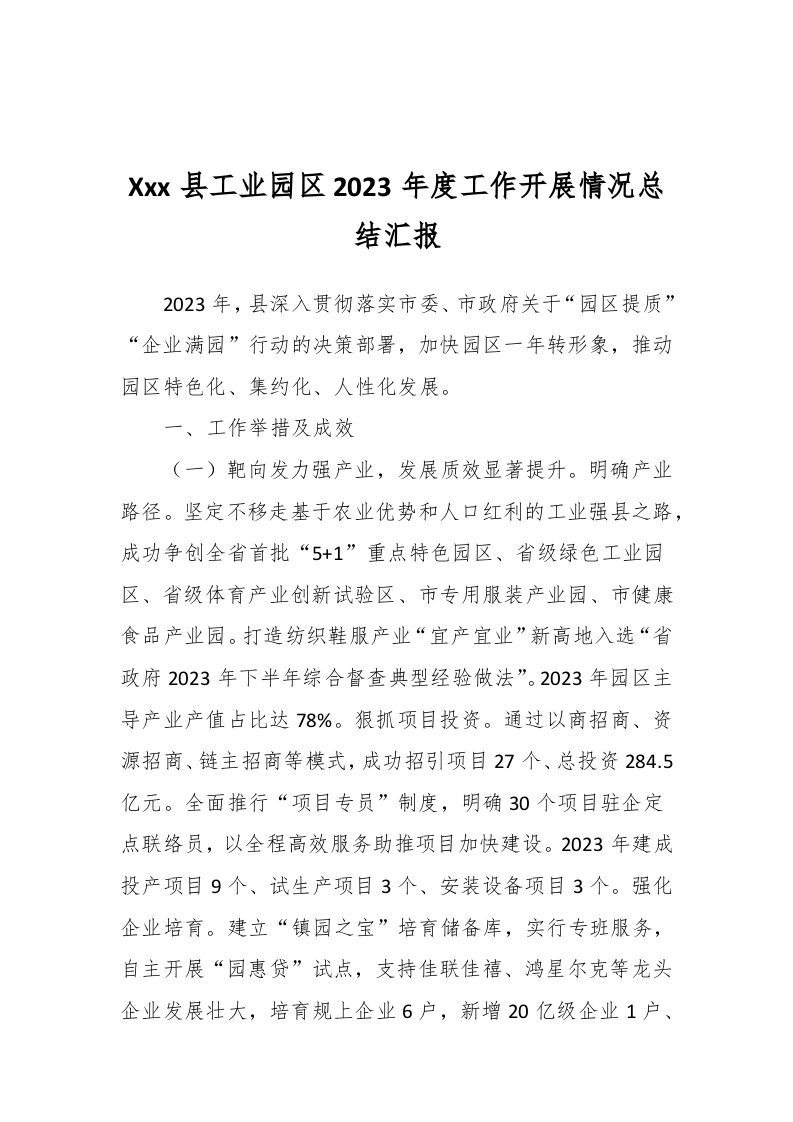 / Xxx县工业园区2023年度工作开展情况总结汇报