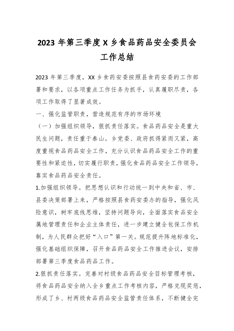 / 2023年第三季度X乡食品药品安全委员会工作总结