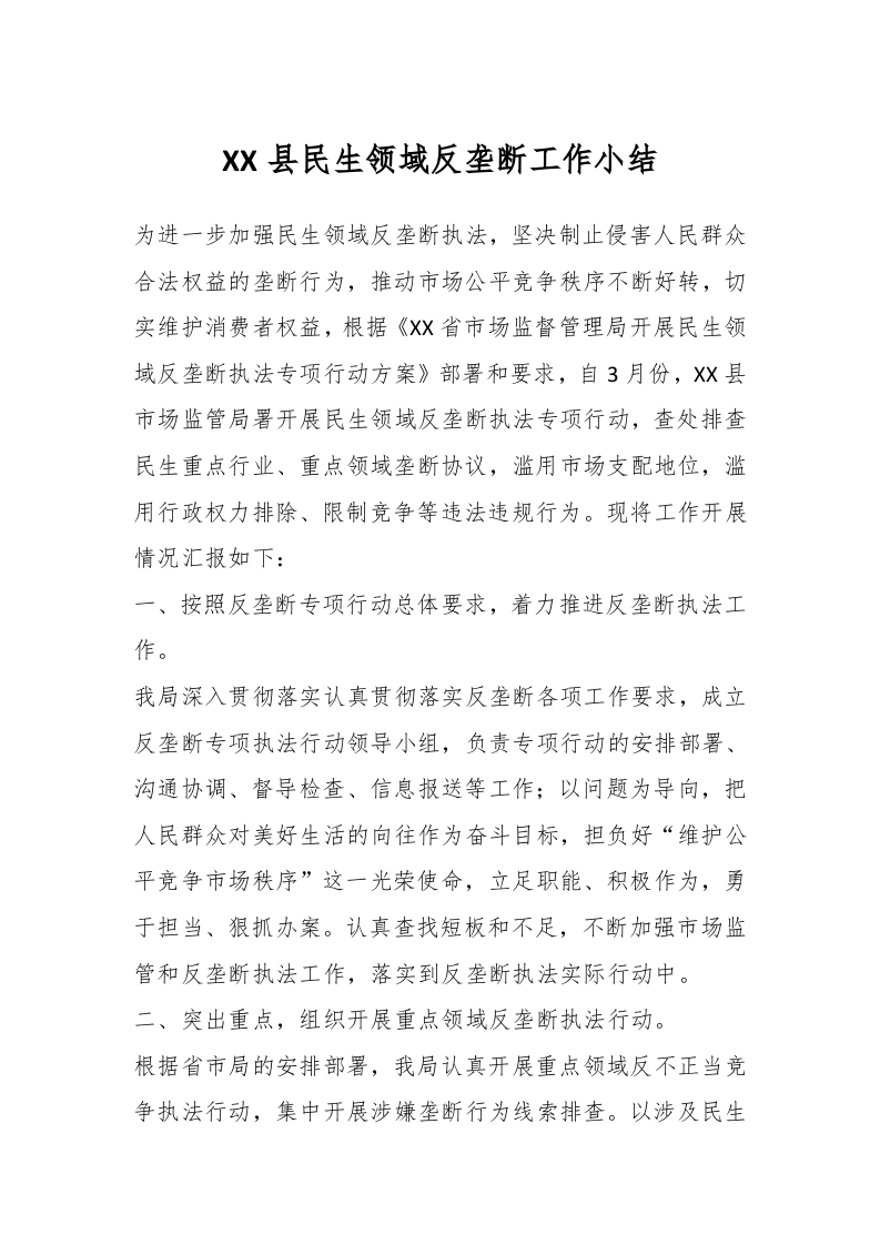 / XX县民生领域反垄断工作小结