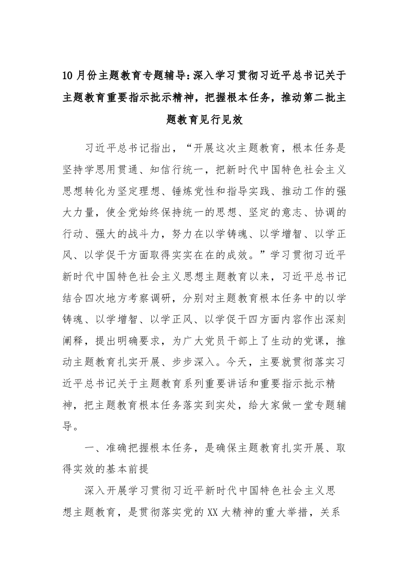 10月份主题教育专题辅导:深入学习贯彻习近平总书记关于主题教育重要指示批示精神,把握根本任务,推动第二批主题教育见行见效